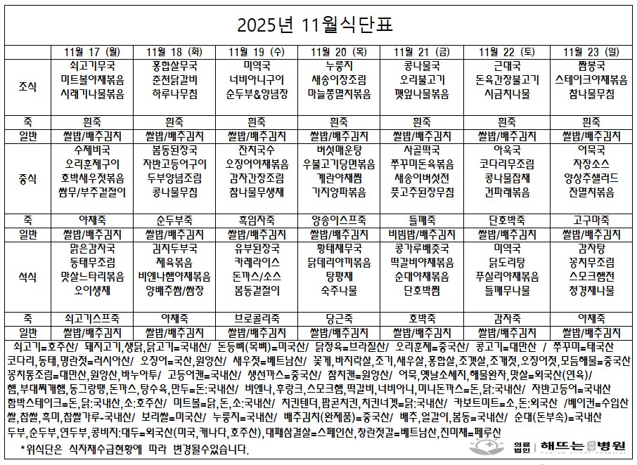 "매일 해뜨는 요양병원에서 제공되는 식단입니다"