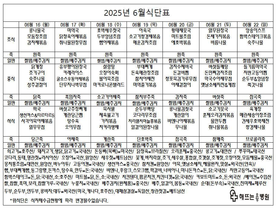 "매일 해뜨는 요양병원에서 제공되는 식단입니다"